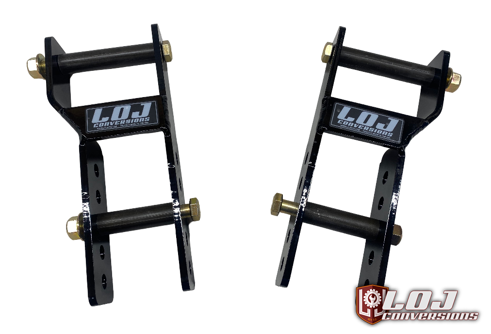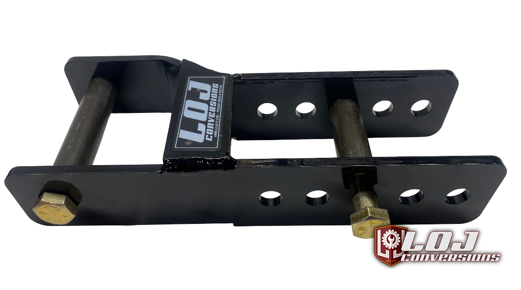 The LOJ Conversions Rear Lift Shackle raises the rear of the vehicle from 0.5" to 2.5" in 1/2" increments when combined with a stock leaf spring/axle orientation, and allows adjustment from 2.75" to 5.25" of rear drop in 1/2" increments when combined with our axle flip kit. Powdercoated steel for corrosion resistance. NOTE: Rear drop will vary based on vehicle weight and condition of rear leaf springs. LOJ does NOT recommend anything greater than 4" of drop to maintain acceptable rear suspension travel.