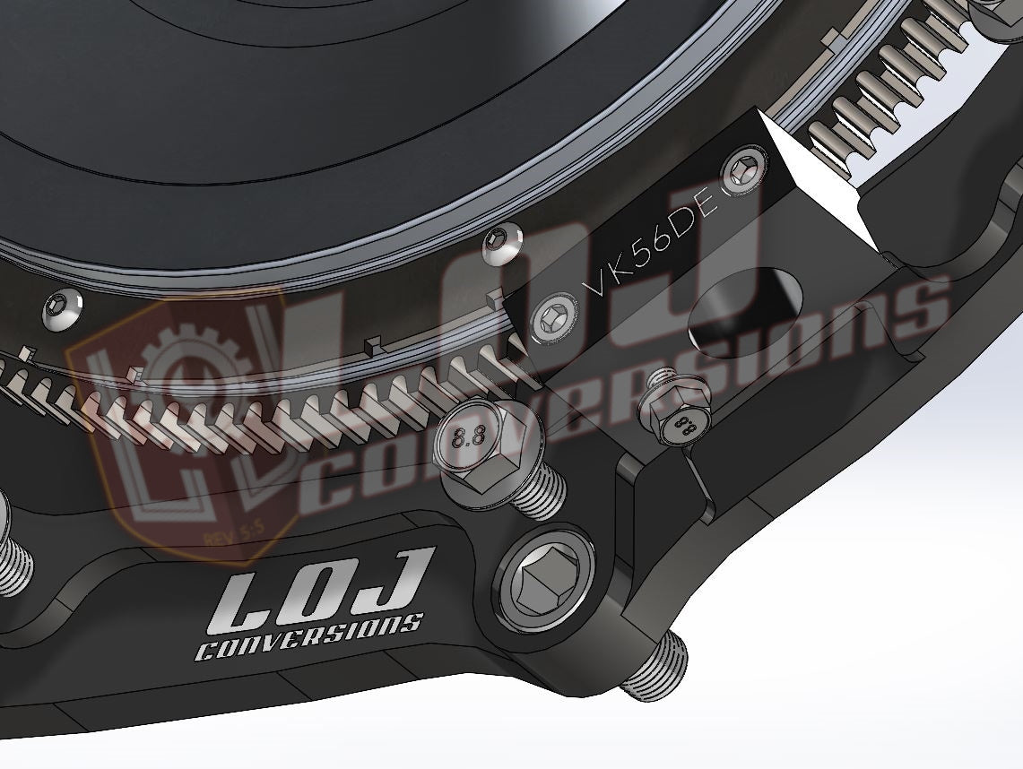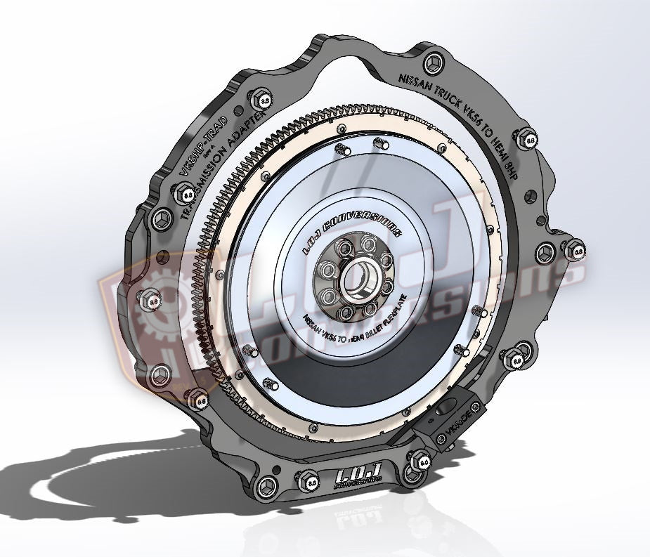The LOJ Conversions Gen III/IV Nissan VK56 Engine to Hemi 8HP / ZF8 (8HP70, 8HP75, 8HP90, 8HP95) Transmission Adapter specifically designed for mating to sought after ZF 8-Speed transmissions to your favorite Nissan V8 Engine! The straight-forward approach and overall simple design will allow a seamless integration of the VK56 Truck engines with the Hemi Truck and Car versions of the ZF8. The adapter plate design incorporates a 360* mounting surface and mounts to the VK56DE and VK56VD engines and oil pans.